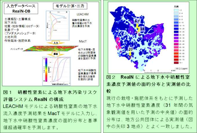 - 農地由来の硝酸性窒素による地下水汚染リスク評価システムRealN(Risk evaluation for agricultural leached Nitrogen)は、土壌中の窒素形態変化・移動と作物吸収を記述するLEACHMモデル(Hutson、2003)と地域的化学物質輸送モデルMacT(Mixing areal chemical Transport、研究成果情報第27集)から構成されます。