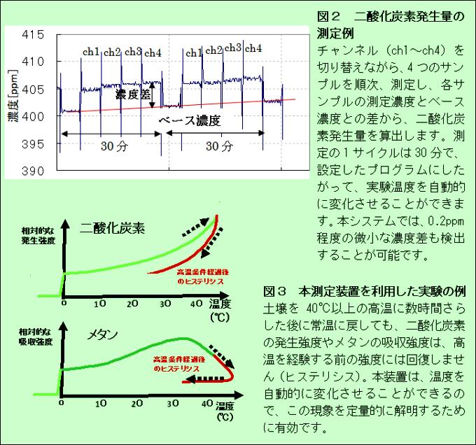 - 通気式チャンバー法を用いて、温度環境を精密に制御し、かつ自動的に変化させながら、採取した土壌のガス交換量(吸収量または発生量)を測定する実験装置を開発しました。この装置は、システム制御部、流量・導入ガス濃度制御部、チャンバー搭載温調部(-20〜80℃の範囲で制御可能)で構成され、測定対象とするガスの分析部を接続して、実験を行います(図1)。チャンバー全体を培養器内に格納し、あらかじめ設定したプログラムにしたがって、培養器内の温度と土壌の雰囲気ガス濃度を自動的に制御します。バルブを切り替えることにより、4つの土壌サンプルを同時に、しかも温度を変化させながら連続的に測定することができる(図2、二酸化炭素の例)ので、温度変化が土壌のガス交換に及ぼす影響を容易に実験することができます。たとえば、土壌がいったん高温にさらされた後には、それ以前に比べて二酸化炭素発生量やメタン吸収量が低下する現象を、定量的に観察することができます(図3)。