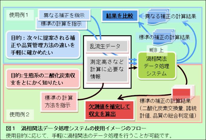 - 渦相関法は農耕地、草原、森林等の生態系による二酸化炭素の交換量(吸収または放出量)の測定法として標準的に利用されています。しかし、そのデータ処理には複雑な計算が必要で、処理システムの開発は利用者側に委ねられています。微気象学を専門としない利用者でも手軽に最新の知見にもとづく計算ができ、また、専門家にとっては次々に提案される補正や品質管理法を容易に試行できるデータ処理支援システムが求められています。