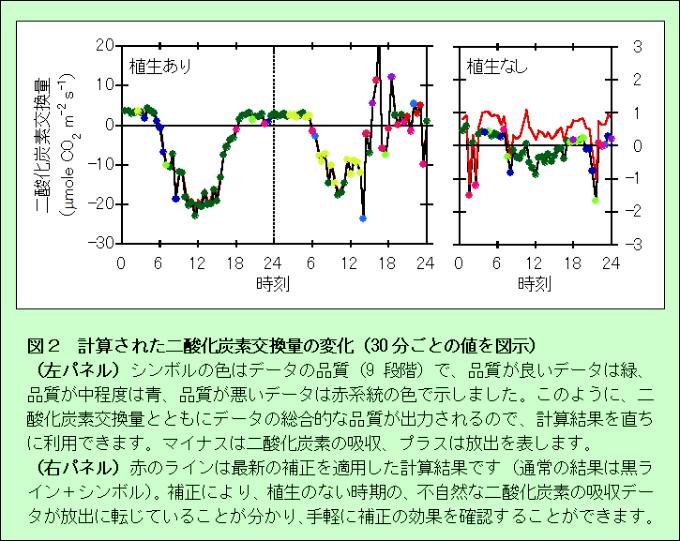- 専門誌に投稿されている最新のデータ処理手法を取り入れました。従来の手法で求めた計算結果とも容易に比較できます(図2右パネル)。データ処理手法が新たに提案された場合にも対応でき、将来は欠測値の補完や光合成と呼吸量の分離などにも対応する予定です。