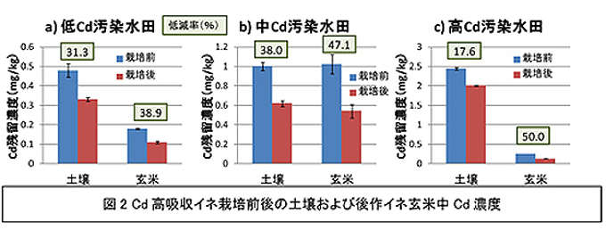 2) 「早期落水栽培法」で Cd 高吸収イネ品種を 2〜3 作栽培し、その都度地上部を水田の外へ持ち出すことにより、高吸収イネ品種による早期落水栽培法を実施しない対照区と比較して、水田土壌の Cd 濃度が 20〜40 %減少し、浄化後に栽培した玄米中の Cd 濃度が 40〜50 %減少します(図 2)。 また、この方法によって、Cd 吸収量を高めることができます。