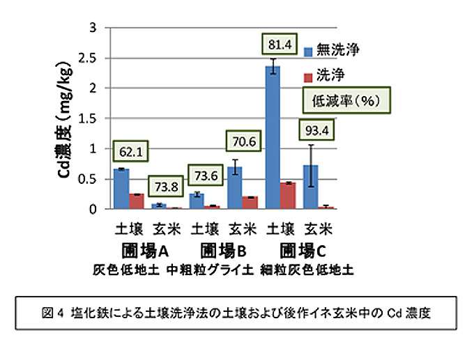 2. 塩化鉄(III)溶液を投入して、土壌に吸着している Cd を水中に溶出させて除去することによって、水田土壌の Cd 濃度が約 60〜80 %、洗浄処理後に栽培した水稲では 70〜90 %減少しました。