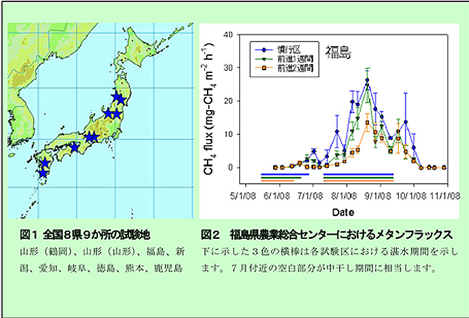 - 中干し期間の延長による水田からのメタン(CH4)発生削減効果に関する実証試験を、全国9カ所で、それぞれ2 年間行いました(図1)。各地での実証試験では、地域ごとの慣行の中干し期間を前或いは後ろに延長し、CH4 発生量の変化を観測しました。その結果、図2 に示す福島県での観測例のように、中干しの延長(前倒し)によりCH4 発生は効果的に削減できることが明らかになりました。各地で計測された中干し期間の延長とCH4 発生比率には図3のような曲線関係が認められ、慣行に比較して中干しを一週間程度延長すると18〜72%程度CH4 の排出が削減されました。また、CH4 削減効果が生じるのは前年に稲わら等の有機物がすき込まれた圃場であることがわかりました。中干しを延長することによる一酸化二窒素(N2O)の発生量の増加は、CH4