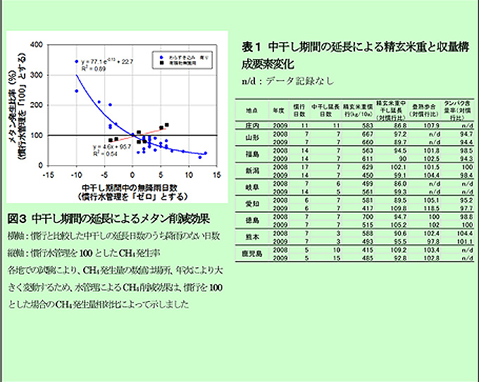 - 水田土壌由来のメタンは我が国の人為起源メタン発生量の約30%を占めます。温暖化防止のために、水田からのメタン発生を削減する有効な緩和策の一つとして、中干し期間の延長が考えられます。しかしどのくらいの期間の中干しが有効であるのか、収量などへの悪影響はないのかなど不確かな点が多く、普及は進んでいません。そこで全国8県9か所における実証試験により、中干し延長によるメタン発生削減効果とコメ収量変動等とへの影響を明らかにしました。