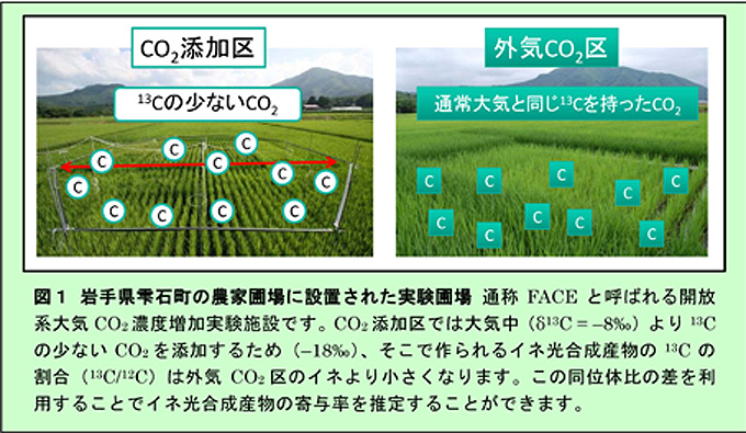 - 水田土壌中で生成されるメタンは強力な温室効果ガスであり、主にイネの通気組織を通って大気へ放出されます。一方、メタンの基質として栽培中のイネがどの程度寄与しているかを圃場で調べた例はなく、メタンの由来に関する理解を妨げていました。本研究では開放系大気 CO2 濃度増加(FACE:Free-Air CO2 Enrichment)実験で用いた CO2 の炭素安定同位体比が外気と異なることを利用し、生成されたメタンに占める「栽培中のイネ光合成産物」の割合とその温度応答を、FACE 実験水田で調べました。