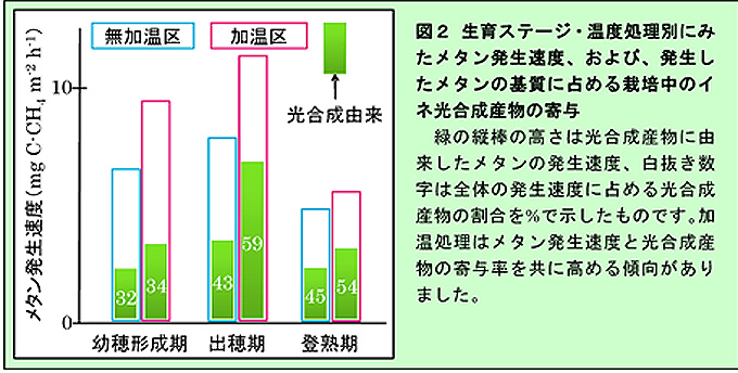- 「栽培中」のイネの光合成産物が、水田土壌から発生するメタンの主要な基質の一つであることを、圃場条件下で初めて明らかにしました。また水・地温の加温処理によって増加するメタンの基質としても、イネ光合成産物の寄与が大きいことが分かりました。