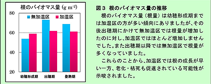 - 水田からのメタン発生における光合成産物の寄与を実際の圃場条件下で明らかにするため、岩手県雫石町の FACE 実験施設で試験を行いました(図1)。発生したメタン中の炭素のうち、栽培期間中のイネの光合成に由来する割合は、幼穂形成期で30%、出穂期以降では40%以上に達し、イネ根圏へ転流された光合成産物がメタンの重要な基質であることが明らかになりました。また FACE 試験区内で行った +2℃の水・地温加温処理でメタン発生速度は増加し、その際に光合成産物の割合も増加する傾向にあったことから、加温で増えるメタンの基質としても光合成産物が重要であることが分かりました(図2)。メタン生成に使われた光合成産物としては「根から土壌への滲出有機物」や「枯死根」が想定されます。加温処理によって出穂期以降の根量が減少したことから(図3)、加温が根の老化・分解を促進したことがメタン発生量増加の重要な要因であると推察されました。本研究成果は、メタン発生にかかわる炭素の流れを開放系の水田で実測した世界初の例で、発生予測モデルの精度向上を図る上で有用な知見です。