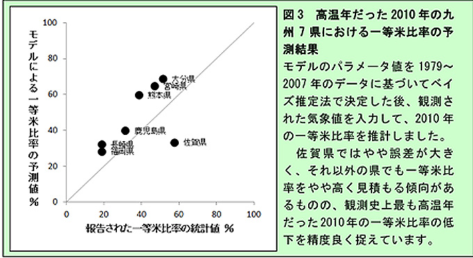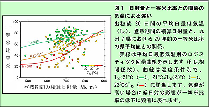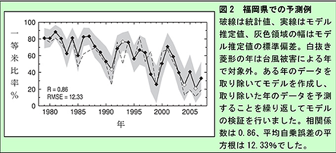 - 近年、西日本を中心に高温や低日射に伴う一等米比率の低下が報告されています。一等米比率の低下には様々な要因がありますが、気象条件が一等米比率に及ぼす影響を解明することは、対策の立案に有用な情報となります。そこで、九州を対象として、一等米比率の県平均値の変動を気象・生育データから説明する簡易なモデルを作成しました。