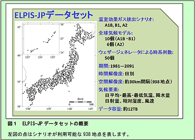 - ELPIS-JP データセット(図1)は、気候変化が日本の農業分野に及ぼす影響と気候変化への適応・緩和策の検討のために作成された気候変化シナリオデータセットです。気象官署およびアメダス4 要素観測地点(合計938 地点)で1981-2091 年の111 年間について農業研究に使用される多くのモデルの入力値として必要な7 種類の気候要素(日平均・最高・最低気温、降水量、積算日射量、相対湿度、風速)の日別時系列値が利用できます。