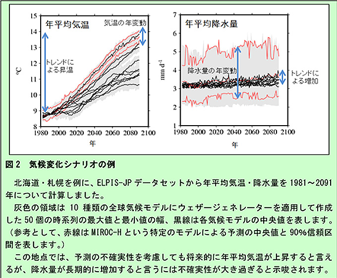 観測された気象要素の時系列は統計的に起こり得た現在気候シナリオの一つに相当します。多数のシナリオを用いることで、単一のシナリオでは描き出すことができない気候要素の将来変化の不確実性についての情報が得られます(図2)。また、水稲の開花期といった作物の特定の生育ステージにおける高温の発生確率を推定するなどの応用も可能です。