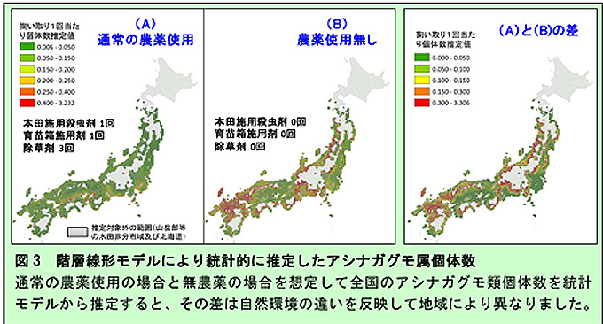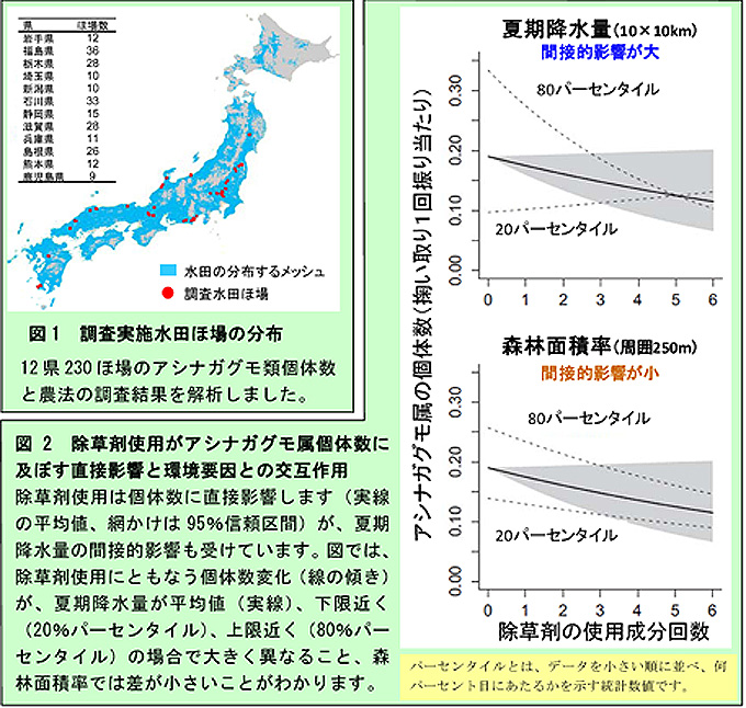 - 水田における環境保全型農業が生物多様性に及ぼす効果について、指標生物であるアシナガグモ類の個体数と農法及び環境要因との関係を全国調査結果から統計的に解析し、農薬削減の効果が自然環境の影響を受けて地域間で異なることを明らかにしました。