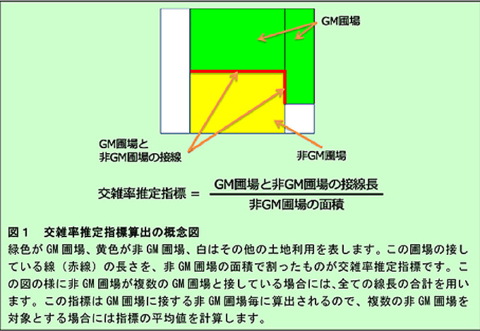 - 交雑率推定指標は、複雑なシミュレーション計算により算出する交雑率を、より簡便に推定するための指標です。算出式は(GM 圃場と非GM 圃場の接線長)/(非GM 圃場の面積)とし、デジタル地図の情報を利用してGM 圃場に接している非GM 圃場一筆毎に計算します(図1)。地域スケールなど広域での評価には、推定指標の平均値を求めました。