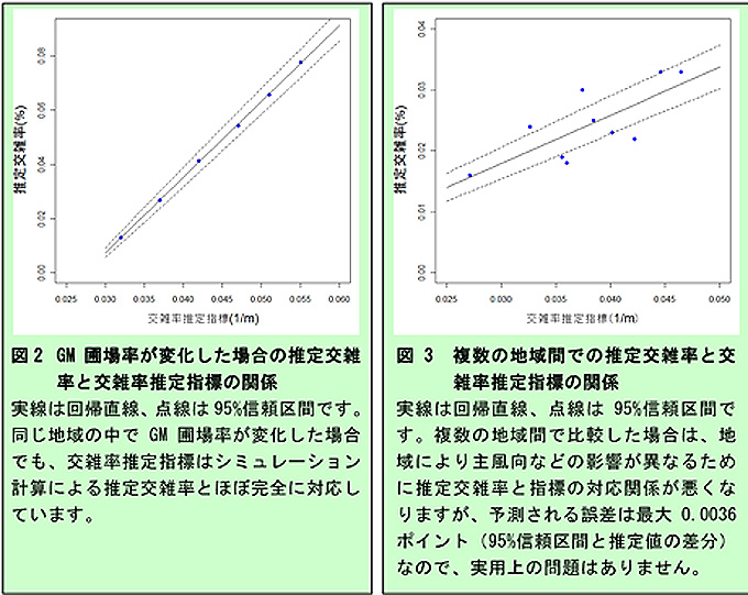 - 遺伝子組換え(GM)水稲と非GM 水稲の交雑率を、地域スケールで評価するための指標を開発しました。この指標はGM 水稲と非GM 水稲の圃場が接する部分の長さと非GM 水稲圃場の面積を基に算出され、デジタル地図と地理情報システムを利用することにより広域での交雑率を簡便に推定することができます。