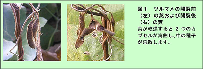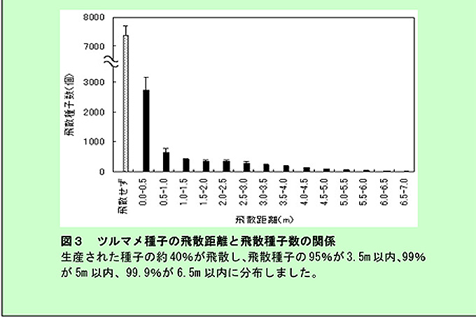 - ツルマメはダイズの祖先種とされる雑草で日本にも分布しています。また、成熟すると莢がはじけ、種子が飛び散ります。本研究では、遺伝子組換えダイズとツルマメとの交雑を防止するため、ツルマメ種子の飛散距離とその頻度を明らかにしました。