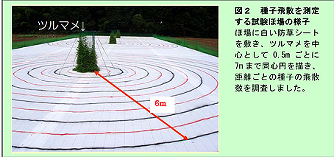 - ツルマメの種子が、最大どのくらい遠くまで、どの程度莢が開裂してはじけ飛ぶ(以後「飛散」とする)かについて調べるために、種子が転がりやすいように粘着性のない白い防草シートを敷き、ツルマメを中心として0.5m ごとに同心円を描き、距離ごとの種子の飛散数を数えました(図2)。つる性のツルマメがセイタカアワダチソウなどの植物にからみつき、草丈を伸ばすことを考え、高さ1.8m の箱状の網を設置しました。その結果、1区画(ツルマメ20 個体)あたり約13,000 個の種子が生産され、莢が開裂しないものもありましたが、そのうち約40%の種子が飛散し、その数はその距離とともに減少することがわかりました(図3)。私たちは一般化線形モデル(GLM)を用いてこの結果を解析しました。そして、飛散した種子の95%が3.5m 以内、99%が5m 以内、99.9%が6.5m 以内に分布することを明らかにしました。また、このモデルは、調査種子数や草丈などが異なる実験条件で行われた過去の結果(Li ら1997、Oka1983)ともほぼ一致しました。