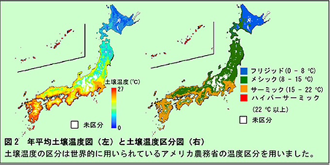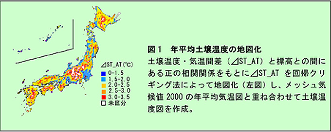農林水産省および気象庁が実施した、表層から深さ30‐50cm の位置での土壌温度モニタリング(1930 年代から1960 年代にかけて全国108 地点を対象)の結果をもとに、年平均土壌温度から年平均気温を差し引いた値(儡T_AT)と気象・地理的な関係性との検討を行いました。儡T_ATと標高との間に正の相関関係(r = 0.46)が認められ、得られた回帰式{儡T_AT(oC) =0.0015(oC m-1)x 標高(m)+1.8}とその予測誤差を用いた回帰クリギング法と呼ばれる地図化手法により儡T_AT の図を作成しました(図1)。気象業務支援センターが提供しているメッシュ気候値2000 の年平均気温図と儡T_AT 図を重ね合わせることで解像度1km の年平均土壌温度図(図2)を作成しました。年平均土壌温度の地図化に伴う二乗平均平方根誤差は0.47℃(既存の公開データを使用)となり、高精度で予測できていることが明らかとなりました。