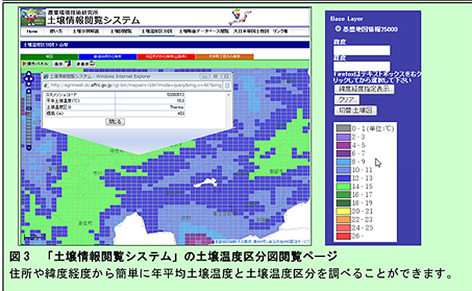 年平均土壌温度図は農環研が公開している「土壌情報閲覧システム(http://agrimesh.dc.affrc.go.jp/soil_db/) (システム更新作業のためサービス休止中 [2013年2月20日]) 」で閲覧することが可能です(図3)。「土壌情報閲覧システム」の土壌温度区分図閲覧ページから、住所もしくは緯度経度を入力することにより簡単に土壌温度図を検索できます。また、土壌温度図から土壌図への画面切り替えも簡単にできるため、土壌温度とともに農地土壌の種類や作土層の理化学性なども合わせて調べることが可能です。