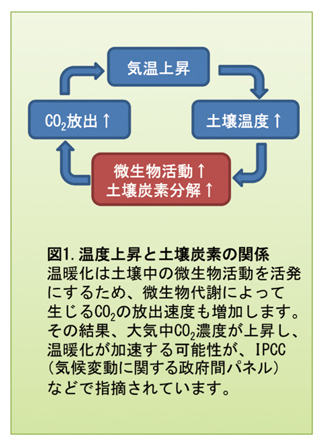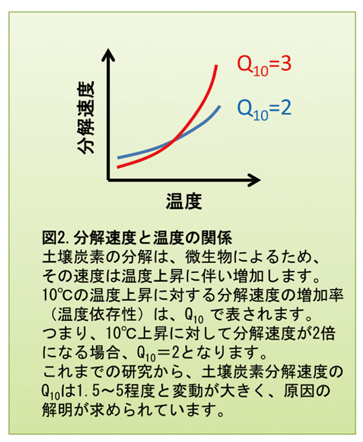地球全体の土壌炭素の総量は、大気中 CO2 または植物バイオマス炭素の約 2〜3 倍以上と推定され、その多くは土壌有機物中に含まれます。土壌有機物の分解は、微生物の代謝によって起こり CO2 を放出させます。そのため、地球温暖化により土壌有機物の分解が早まることで、温暖化が加速することが懸念されています(図1)。微生物による有機物の分解速度は温度上昇により増加しますが、その増加の程度(温度依存性 Q10 )は、調べる土壌によって大きく変動することから(図2)、分解の Q10 が何によって決まるのかを解明することが、温暖化影響予測のための重要課題となっています。