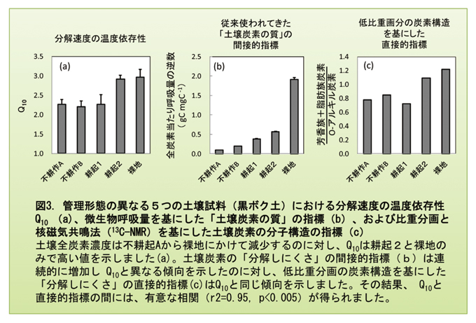 農地管理によって土壌炭素の量や有機物の新鮮さが大きく異なる5つの黒ボク土壌試料を対象に、培養実験から分解速度の Q10 を調べたところ、2.1〜3.1 の差異がありました(図3a)。こうした Q10 の変動は、「土壌炭素の質」、すなわち、土壌炭素の分子構造の違いに起因するとの仮説がありますが、既往研究で使われてきた「土壌炭素の質」の間接的指標(図3b)と実測した Q10 の間に強い対応関係はありませんでした。これは、各土壌中の土壌炭素の状態を一様と仮定しているためであると考えられました。そこで、各土壌から微生物の分解作用を受けやすい低比重画分を分離し、そこに含まれる炭素の分子構造を、固体 13C 核磁気共鳴法によって調べました。その結果をもとに、分解の速い O-アルキル炭素に対する、分解の遅い芳香族と脂肪族の炭素の割合を「土壌炭素の質」の指標とすると、実測した Q10 との間に強い対応関係が得られました(図3c)。これは、「土壌炭素の質」が分解の温度依存性を決めるという仮説を支持する初めての検証結果です。