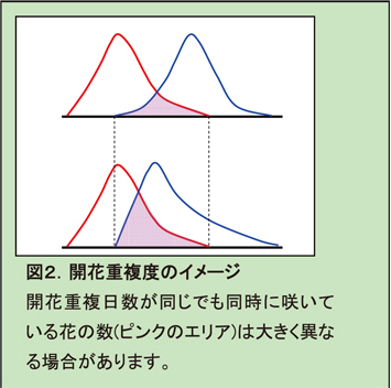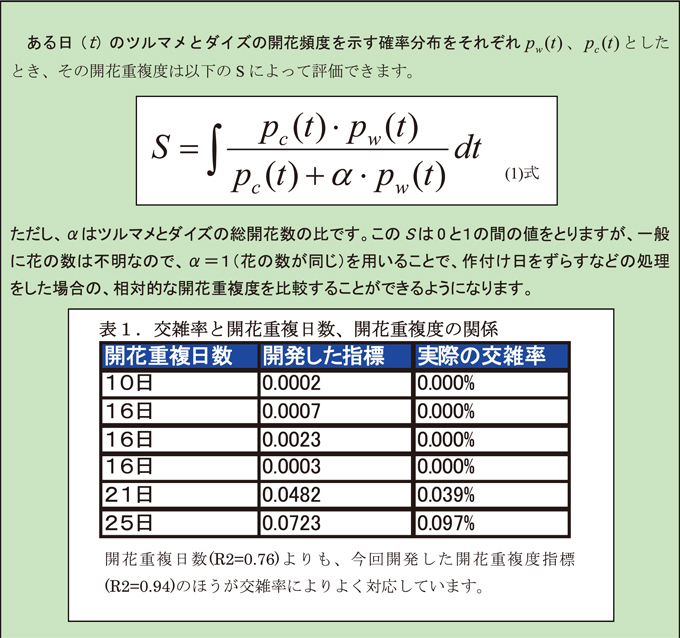 2種の開花数の増減を確率密度分布として捉え、2つの分布間の類似度を示す指標を「開花重複度(S)」と定義することにより、開花重複日数など従来使われてきた指数より正確な交雑可能性の定量的評価が可能になり、交雑抑制のための時間的隔離が高い精度で行えるようになりました。