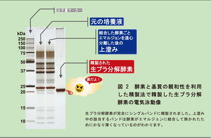 図1 に精製法の概要を示します。生プラ分解酵素を作る微生物の培養液と生プラのエマルジョンを混ぜます (step 1)。すると、酵素と基質の親和性によって、生プラ分解酵素だけが生プラのエマルジョンと結合します (step 2)。この状態で遠心機に掛けると酵素は重たい生プラエマルジョンに結合したまま試験管の底に沈みます。他のタンパク質などの夾雑物はエマルジョンと結合しないので沈まずに上澄みに残ります (step 3)。この上澄みごと夾雑物を除きます (step 4)。試験管の底に残った生プラ分解酵素と生プラエマルジョンの結合物に緩衝液を加えて混ぜると (step 5)、生プラ分解酵素は本来の働きに従って生プラエマルジョンをどんどん分解していきます (step 6)。エマルジョンが全て分解されて溶液が透明になったら透析してエマルジョンの分解産物を取り除きます。これで緩衝液の中には純粋な生プラ分解酵素だけが残ります (step 7)。元の培養液中の雑多なタンパク質の中から生プラ分解酵素が高純度に精製されていることが電気泳動で確かめられました(図2)。収率も65%と高く、また、他の2種の微生物の生プラ分解酵素もこの方法で精製できることを確認しました。