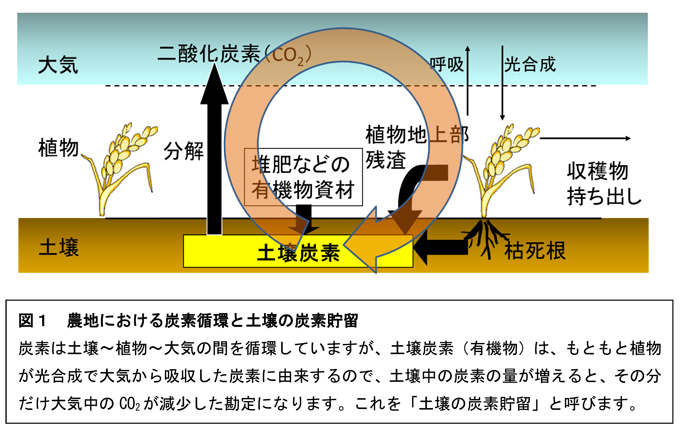 農地の生産力を維持・増進するための有機物管理が、近年、地球温暖化の緩和策の一つとして期待されています。それは、農地に投入する有機物の量を増やすことで土壌中の炭素量が増えると、その分、大気に放出されるCO2が減少することになるためで、これを土壌の炭素貯留(*1)と呼びます(図1)。