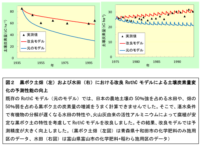 - 1) 土壌炭素の長期的な動態を予測するために英国で開発された土壌炭素動態モデルRothCを、日本において一定量の有機物や肥料を長期間投入し続けた試験(長期連用試験)のデータを用いて検証し、水田や黒ボク土畑が多い日本の農地向けに改良しました(改良RothCモデル(*2))。これにより、管理や場所の条件によって異なる土壌炭素量の時系列的な変化を精度よく予測できるようになりました(図2)。