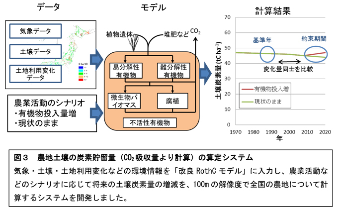 - 2) このモデルを全国規模で適用するため、気象・土壌・土地利用などの環境情報や、農業活動のシナリオを改良RothCモデルに入力して全国の農地における土壌炭素量の変化を100m解像度で計算できる算定システムを開発しました(図3)。
