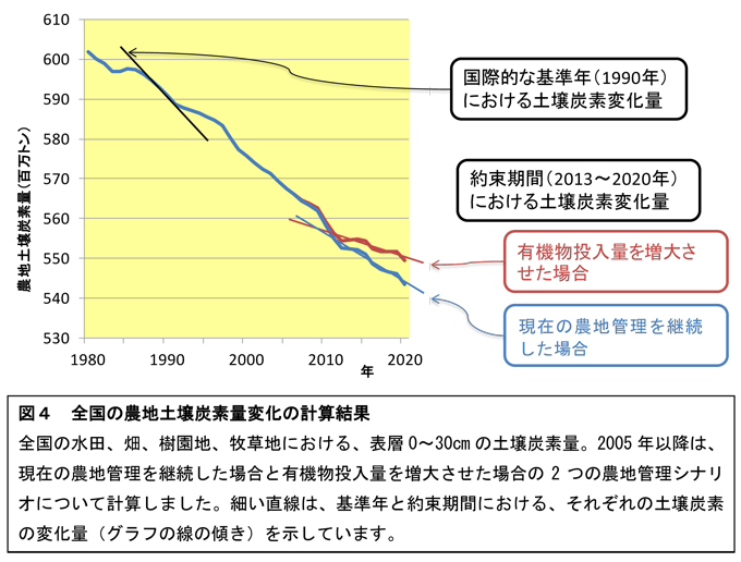 - 3) このシステムを用いて計算したところ、1980年には約6億トン賦存していた全国の農地土壌炭素量は、2010年には約5億6千トンに減少したことが示されました。今後も減少傾向は継続すると予測されましたが、堆肥や作物残さなどの有機物投入量を増大させることにより、減少の程度が低くなることが示されました(図4)。これにより、京都議定書に基づくCO2吸収量算定の国際的なルール(*3)の下で、農地土壌におけるCO2吸収(炭素貯留)を期待できることが明らかになりました。