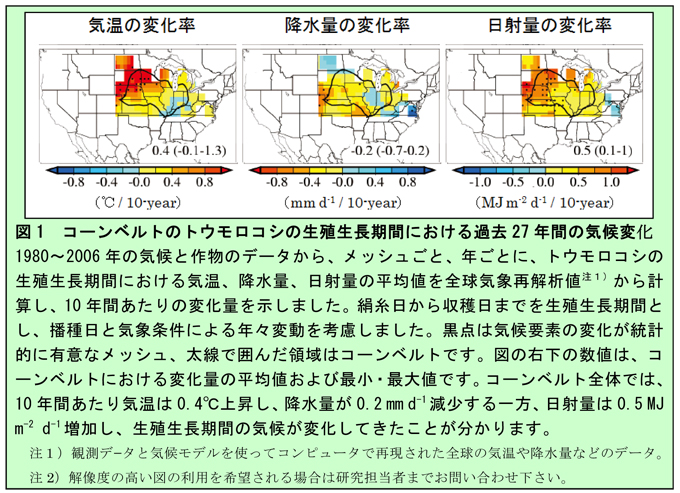 コーンベルトでは 1980〜2006 年の間にトウモロコシの播種日が約2週間早まりました。この播種日の早期化は生育期間を延ばして収量を高めることが目的で、種子の低温耐性の向上や高性能な播種機の導入などによるものです。一方、コーンベルトではトウモロコシの生殖生長期間に、10 年間あたり 0.4 ℃の気温上昇と 0.2 mm d-1 の降水量減少、0.5 MJ m-2 d-1 (MJはメガジュール。1日の累計エネルギー)の日射量増加が観測されています(図1)。
