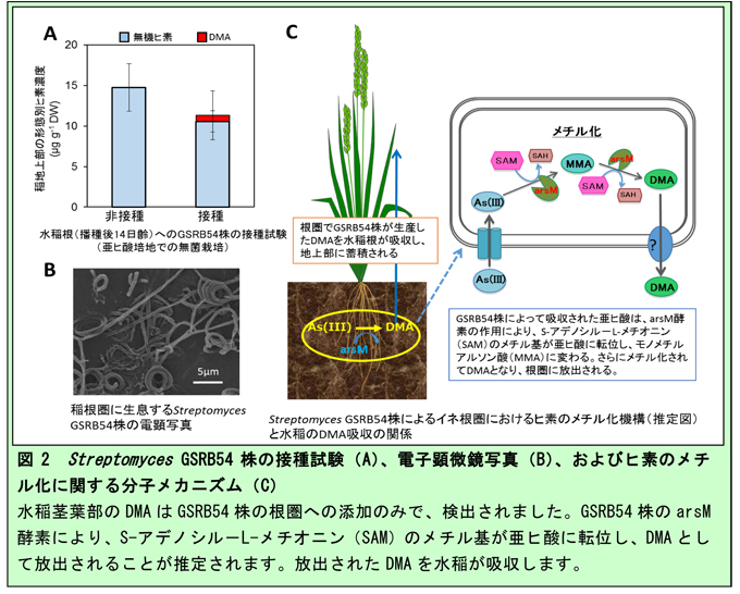 高ヒ素土壌で栽培した水稲から根圏土壌を採取し、平板希釈法による菌の分離およびヒ素接種試験の結果から、亜ヒ酸をメチル化して DMA に変換する機能を有する GSRB54 株を単離しました。16S rRNA の解析結果、GSRB54 株は Streptomyces 属の新種(ジーンバンク Acc No. AB856548)であることがわかりました。さらに GSRB54 株から亜ヒ酸のメチル基転移酵素遺伝子(arsM)を単離することに成功し、これまで報告されている arsM 遺伝子とはアミノ酸配列において相同性の低い、新規の遺伝子であることがわかりました。本遺伝子を亜ヒ酸感受性の大腸菌で高発現させたところ、ヒ素耐性を示し(図1A)、さらに DMA やトリメチルアルシンオキサイドが生産されることから(図1B)、本遺伝子は亜ヒ酸をメチル化する能力があることが立証されました。亜ヒ酸を含む培地で無菌栽培した水稲根(播種後2週齢)に GSRB54 株を接種すると、茎葉部から DMA が検出されました(図2A)。これは GSRB54 株(図2B)によって生産された DMA を水稲が吸収したためと考えられます。arsM 遺伝子の機能は、亜ヒ酸に S-アデノシル−L-メチオニン(SAM)のメチル基を転位する酵素であることが知られているため、GSRB54 株も同様の分子機構を持つと推定しました(図2C)。本成果は稲に含まれる DMA の起源が、根圏微生物由来であることを初めて立証した研究です。