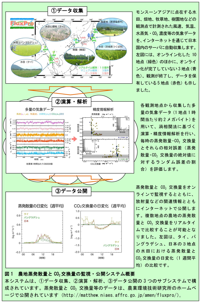 モンスーンアジアのさまざまな農地で計測した気象データをオンラインで収集し、渦相関法に基づいて算定した蒸発散量とCO2交換量に精度情報を付加して監視に利用するとともに、リアルタイムでデータを公開するシステムを開発しました。
