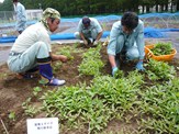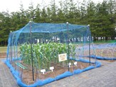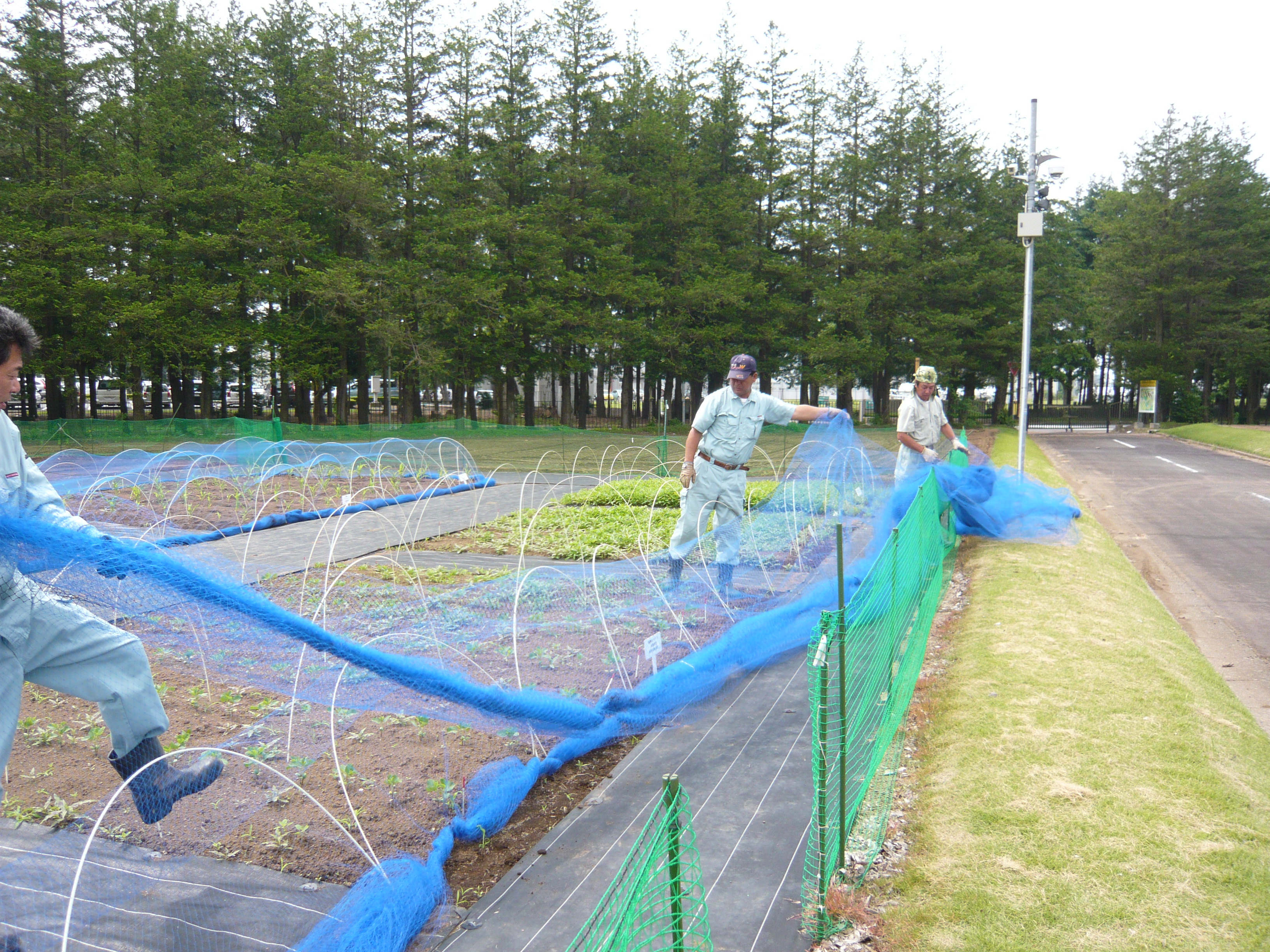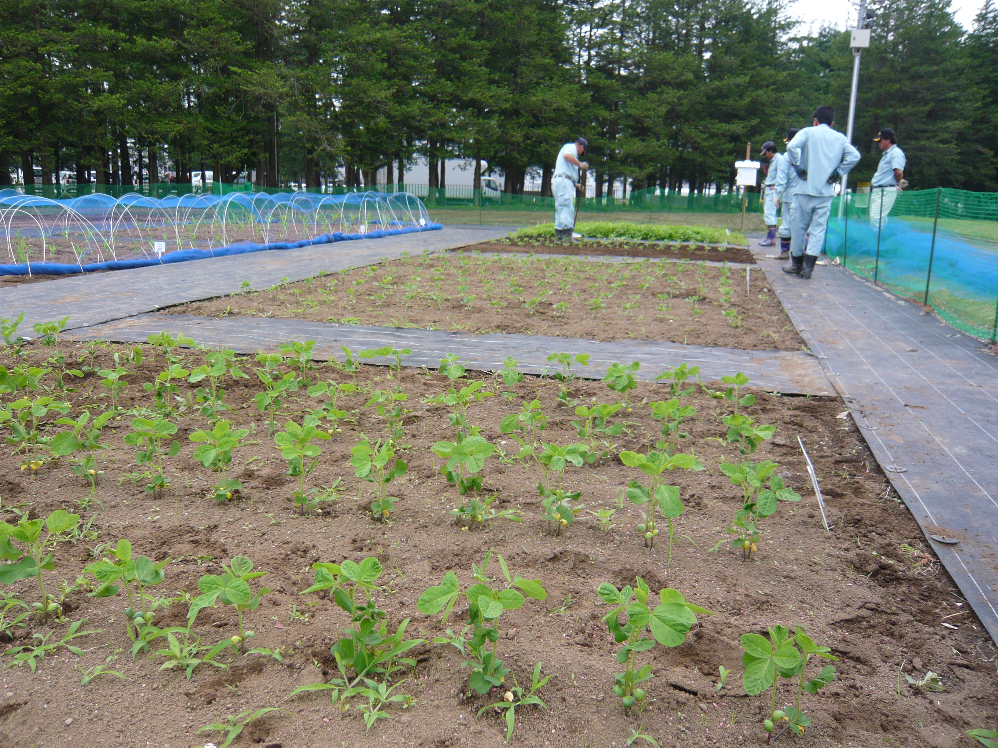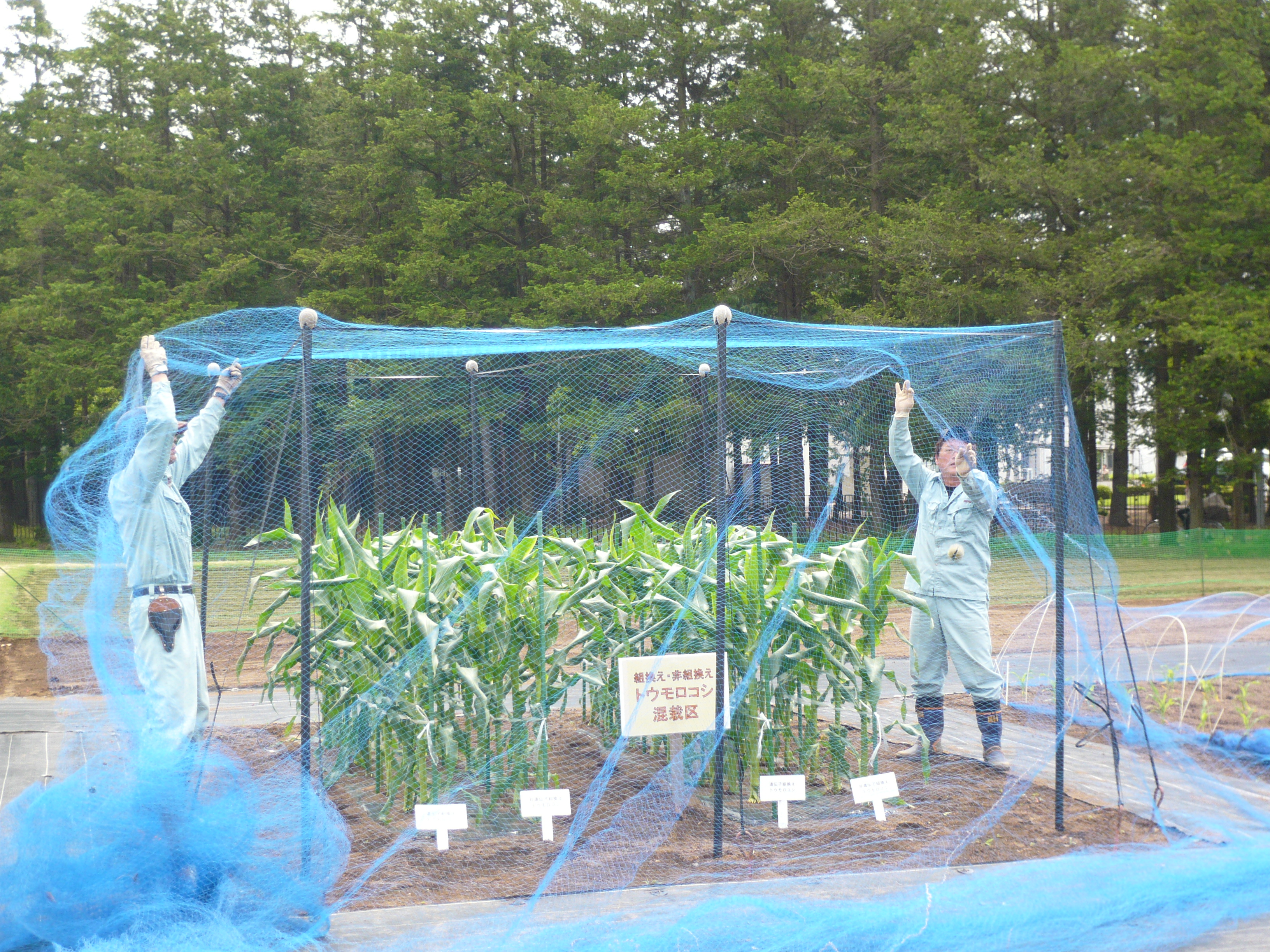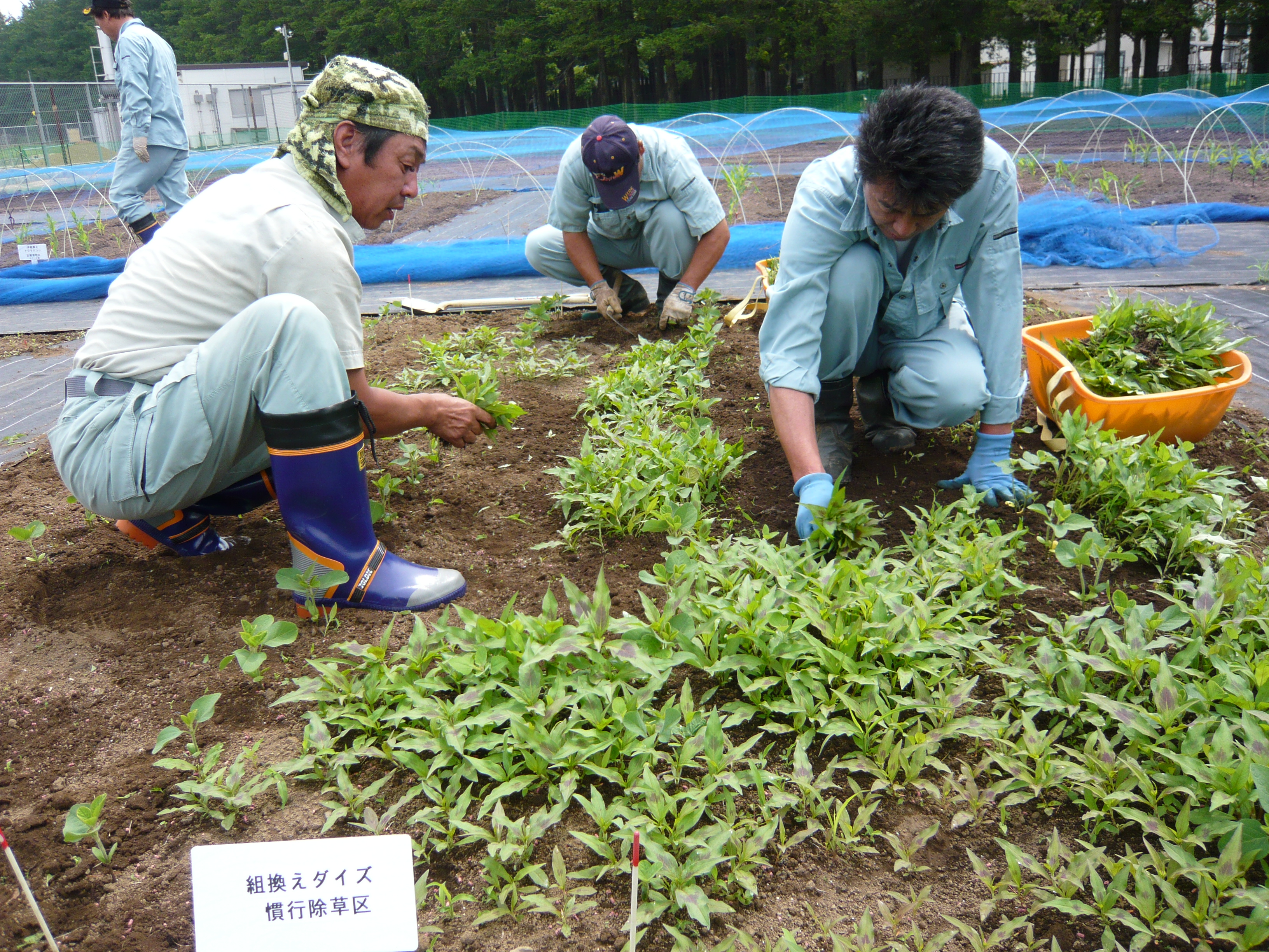 2012年6月28日 (木)遺伝子組換えダイズ及びトウモロコシの様子比較栽培区のダイズの区画に張ってある防鳥ネットを撤去し(写真1)、慣行除草区の除草作業を行いました(写真2)。慣行除草区・無除草区は昨年の雑草の種子が残ってしまっており、例年になく多くの雑草(主にイヌタデ・アカザ)が生育してしまっています。 また、混栽区のトウモロコシはこれから開花、受粉して実が熟していきますが、カラスなどに熟したトウモロコシを食べられないように、防鳥ネットを張りました(写真4、5)。 | ||||||||