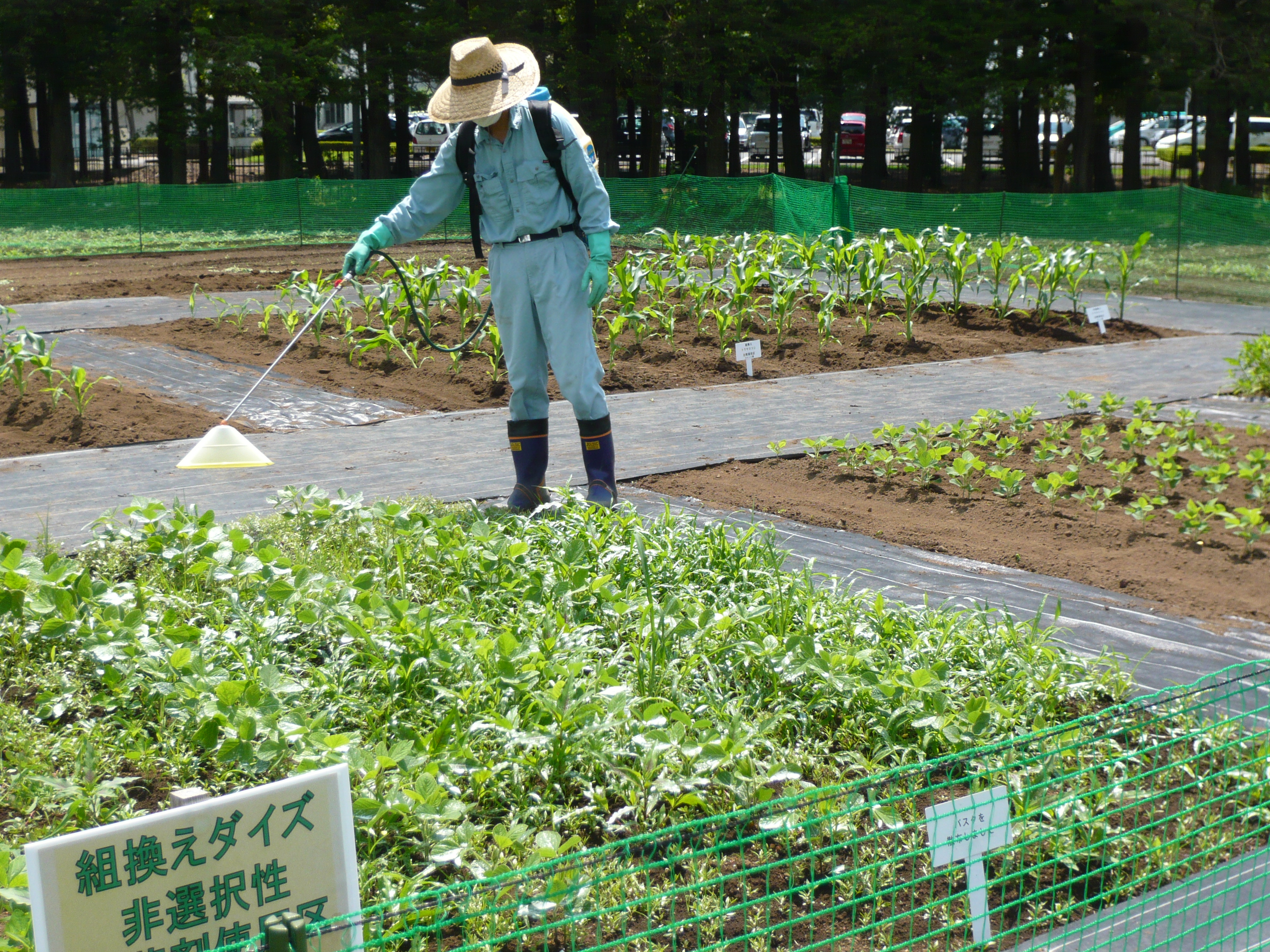 トウモロコシ・比較栽培区の防鳥ネットを撤去し、トウモロコシの間引きを行いました。また、非選択性除草剤散布区にはラウンド・アップおよびバスタの散布(写真2、4、5)をしました。