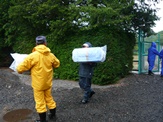 作業後は、長靴を洗浄し(写真10)、靴に履き替えて隔離ほ場から出ました。残った苗は再び密封し、温室に持ち帰って他の実験に使用します(写真9、11)。