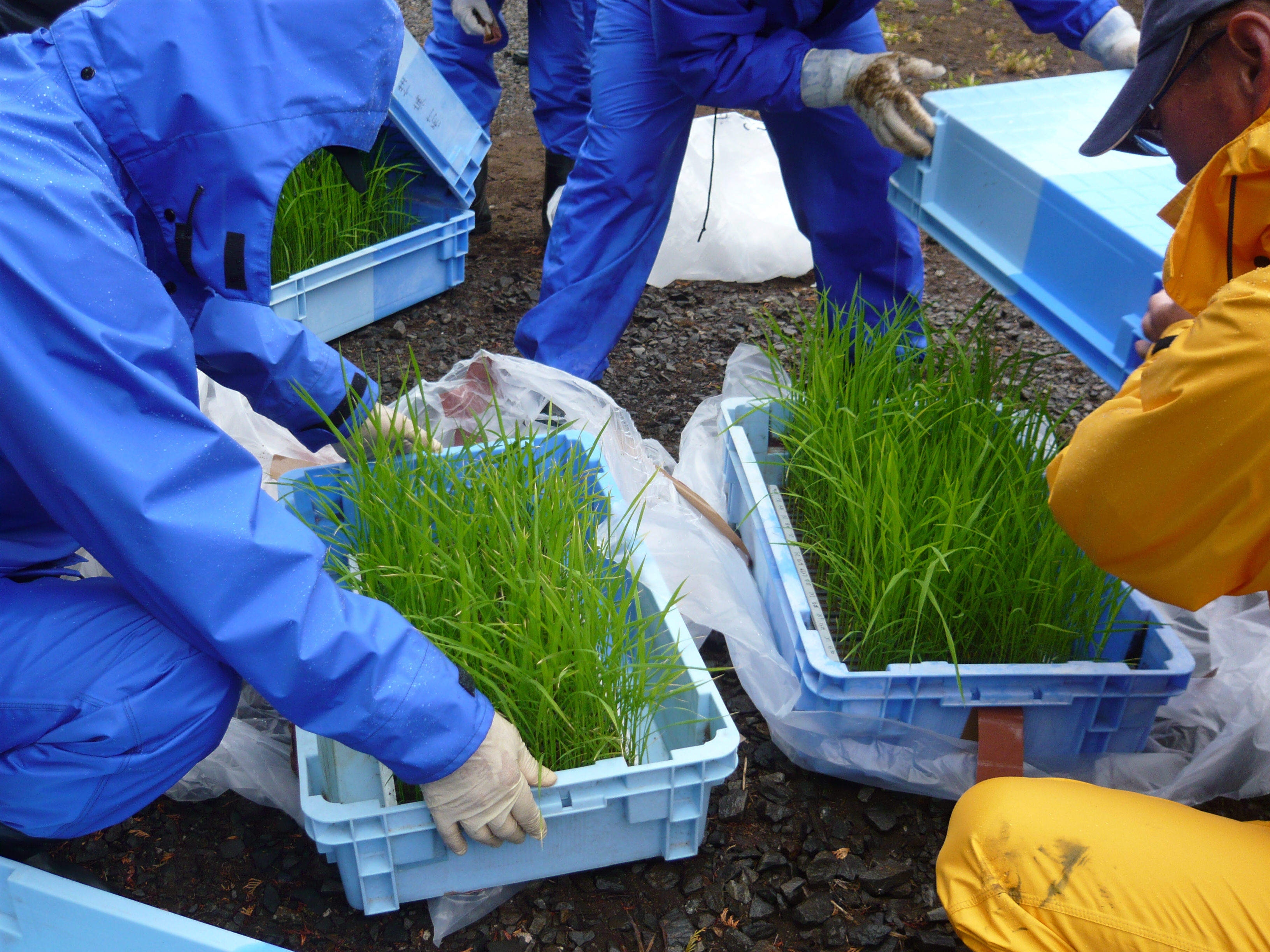 苗は写真1,2のように、密封された状態で温室から隔離ほ場に運び込まれました。それぞれの水田に田植えを行いました(写真5、6)。