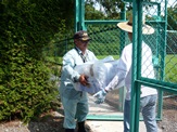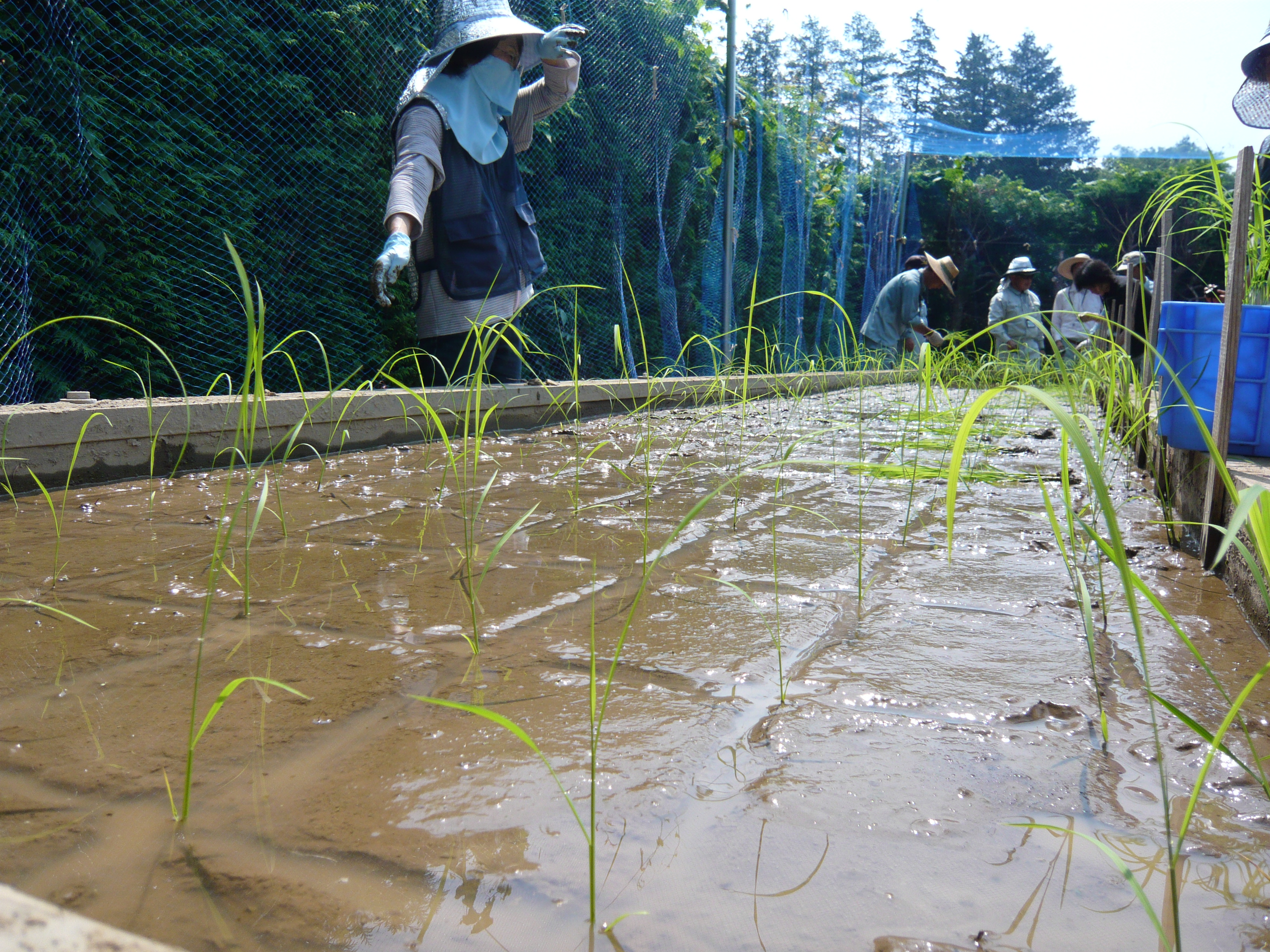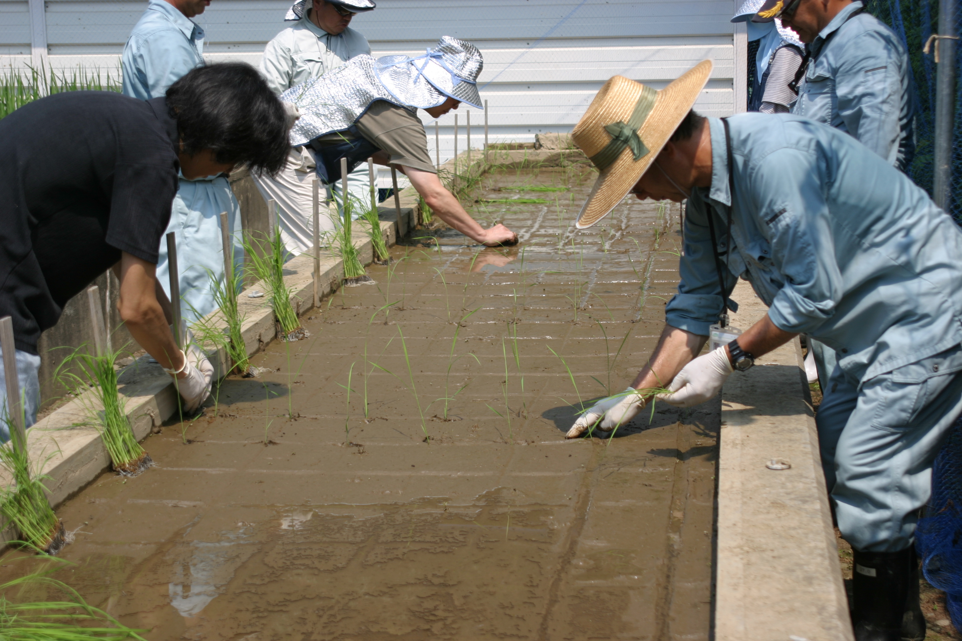 6月22日に一般説明会を開催した、遺伝子組換え複合病害抵抗性イネのうち、「日本晴」とその組換えイネの田植えを行いました。この遺伝子組換えイネは(独)農業環境技術研究所(農環研)内の隔離ほ場内の水田にて栽培します。栽培実験の詳細については栽培実験計画書をご確認ください。