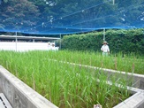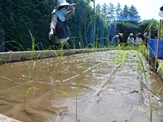先に田植えをした水田1にはコンクリートの枠で作られた小さな水田(枠水田)が3面あり、今回はそのうちの1面に苗を植えました。