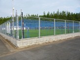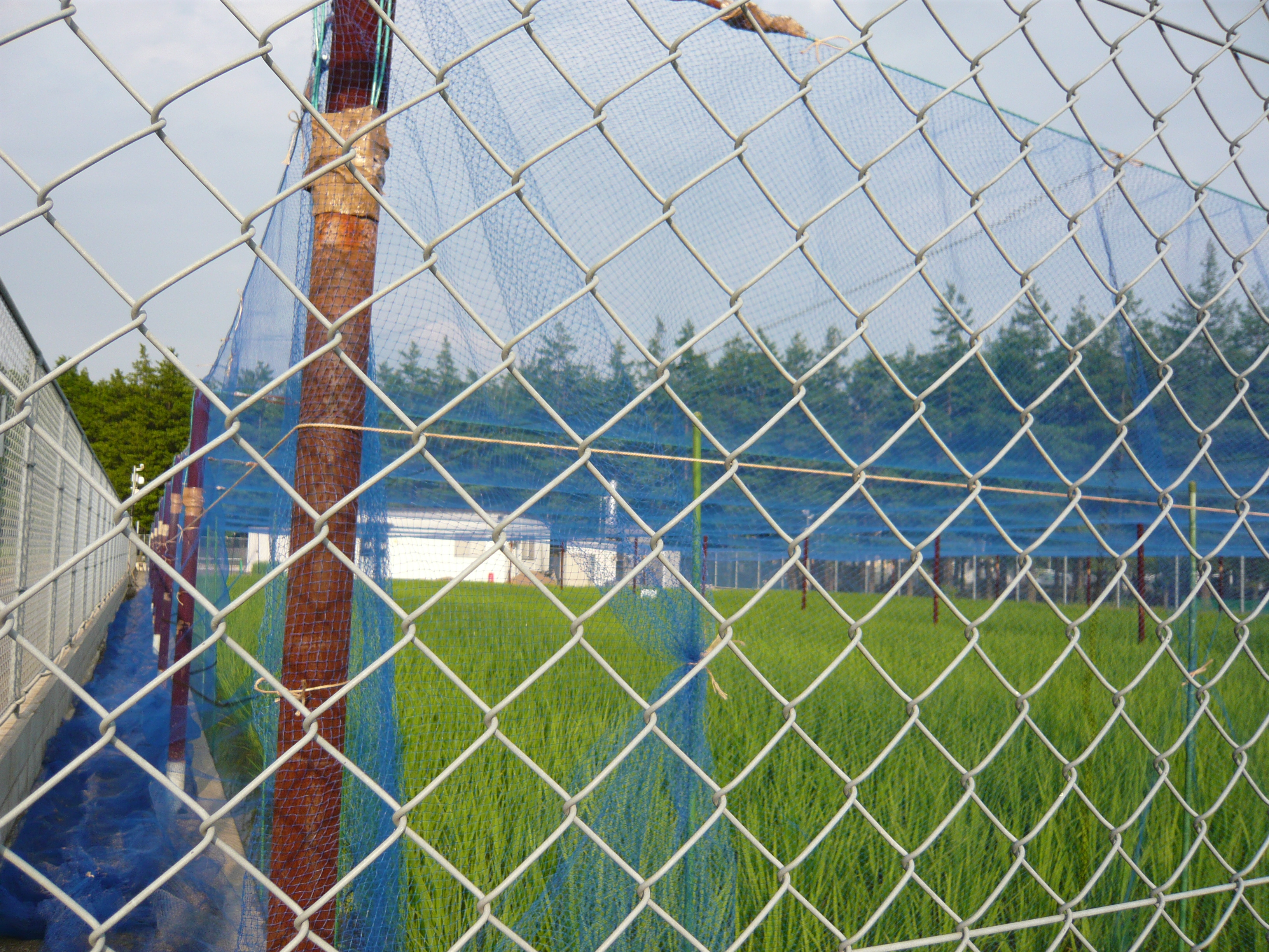 この先、イネの花が咲き、実が実るとスズメなどの鳥に食害されることがあります。それを防ぐため、水田を囲むように防鳥ネットを設置しました。フェンス内の青い網が防鳥ネットです。