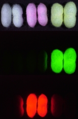 図2.普通繭と緑色蛍光タンパク質、赤色蛍光タンパク質を発現する繭の観察 左:普通繭、中:赤色蛍光タンパク質を発現する繭、右:緑色蛍光タンパク質を発現する繭 [ 農業生物資源研究所トップページ ] [ プレスリリースリスト ] |