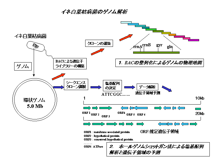 イネ白葉枯病はXanthomonas oryzae pv. oryzae (キサントモナス・オリーゼ)という細菌によって引き起こされる世界的に重大なイネの病害である。また、本病原細菌にはイネ品種に対して病原性が異なる数多くの菌グループが存在し、それらに対応した耐病性品種の育成が重要な課題となっている。そのため、我が国をはじめとして米国の大学、フィリピンにある国際イネ研究所などで耐病性品種育成のためにイネの側からの分子生物学的研究が進められている。例えば、イネ白葉枯病抵抗性遺伝子が農業生物資源研究所のイネゲノム研究チームと米国のカリフォルニア大学でそれぞれ単離されており、それらの抵抗性反応機構の解析が分子レベルで進展している。しかしながら、イネ側の分子レベルでの情報量に対して病原細菌側の情報量は少なく、植物−微生物相互作用解明の点で病原細菌側のゲノム情報が強く求められていた。そこで、イネ白葉枯病菌のゲノム解析によって病原細菌側のゲノム情報を蓄積し、病気を起こすメカニズムを解明することによって、植物−微生物双方の解析が可能となり、持続的な耐病性品種の開発や病原細菌に特異的にかつ効果的に作用する安全な農薬の開発が期待される。