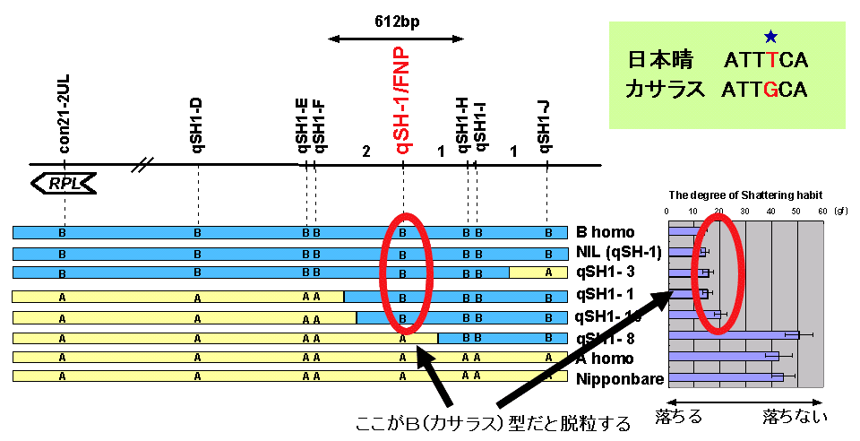 後代検定の結果、一個のDNAの塩基変化が脱粒性遺伝子qSH1の原因であることがわかった。