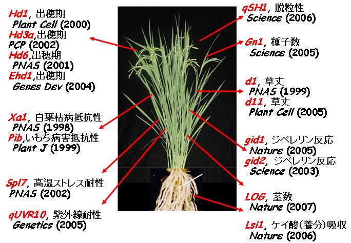 これらの中には、農業上重要な性質を決定している遺伝子が含まれています。例えば、穂の出る時期を決めている遺伝子(Hd1,End1など)や草丈を調節する遺伝子(d1,d11)があります。また、病害虫に抵抗性をあたえる遺伝子 (Xa1,Pib など)も見つけられています。詳細は業績リストをご覧ください。