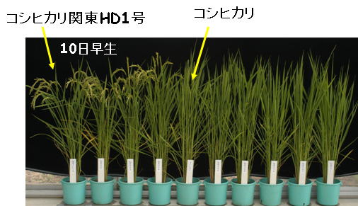 「コシヒカリ」にインド型品種のもつ早生あるいは晩生遺伝子をマーカー選抜で導入しました。その結果、出穂期の異なるイネ、すなわち、収穫期が異なるイネを作り出すことに成功しました。これらのイネは収穫時期が異なっていますが、コシヒカリと同様に良い食味を持つものです。コシヒカリ関東HD1号は水稲新品種20119号に登録されました。
