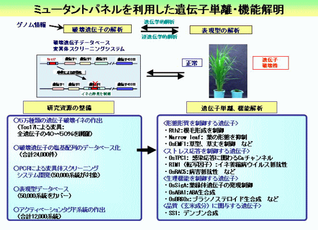 (3)達成目標 : 遺伝子の効率的な生物機能解析技術を開発し、種子成熟・生育等農業上重要な機能を有する遺伝子について特許取得を積極的に行うとともに、イネに導入して新形質を持つ画期的な新品種の育成に資する。