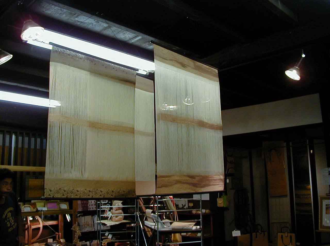 案 内:新治村の「たくみの里」の一角に「木織の家」があります。木織は次のような工程で作られます。まず、品質のよい檜・杉・ひば・ぶななどの原木が選ばれます。原木は、0.08〜0.1mm程度の薄さにスライスされます。漂白・防黴等の処理後、ウレタン樹脂をベースとする薬液に漬け込んで柔軟にさせ、乾燥します。柔軟処理した経木を0.3〜0.8mmの幅に裁断し木糸(ウッドヤーン)を作ります。この木糸を横糸に、絹「世紀21」を縦糸に使い、帯などに金糸銀糸を織り込む伝統的な引箔織「ひきはくおり」の技法で1本づつ折り込み布に仕立てるものです。できあがったものは、木の木目が浮き上がった布になります。
