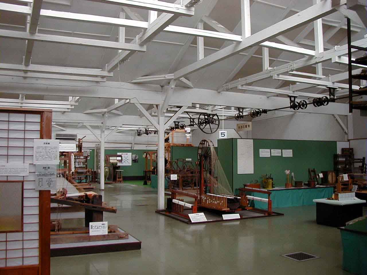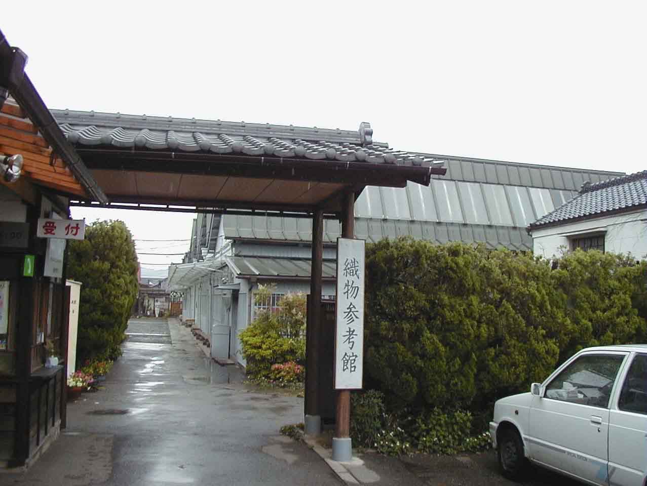 案 内:現在も実際に稼働している織物工場を中心に、染織産業に対する理解と認識を深めてもらおうという意図で作られた資料館です。館内には、明治から昭和にかけて使用された織機や道具、資料等約1,200点が展示されています。まゆから糸をとり、染色して織り上げるまでのシステムが理解できるよう展示には工夫がされています。展示されている織機は、実際に動かしながら説明してくれるので仕組みがよくわかります。特に、ジャガード式織機に使う型紙を作るピアノマシンや日本一大きな高機等、他ではなかなかお目にかかれないものがあり、興味がつきません。見学コースには藍染の竈が作られており、藍染や植物染めが体験できます。現在実際に活動している織物工場を解り易く安全に見学できるようにしてあるので、縦糸と横糸から複雑な模様が織り出されていく様をみることができます。