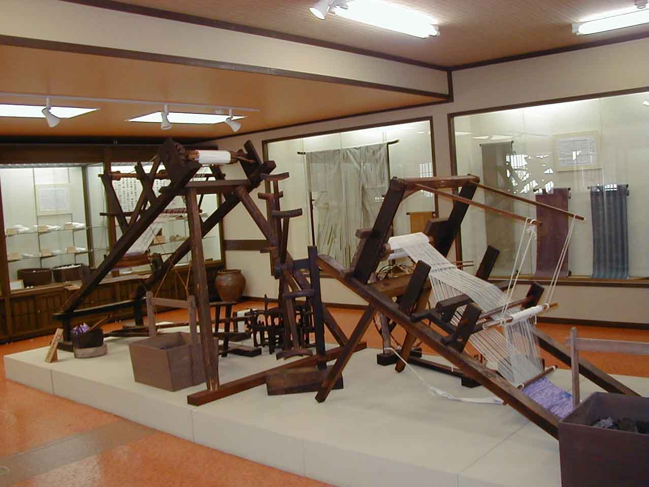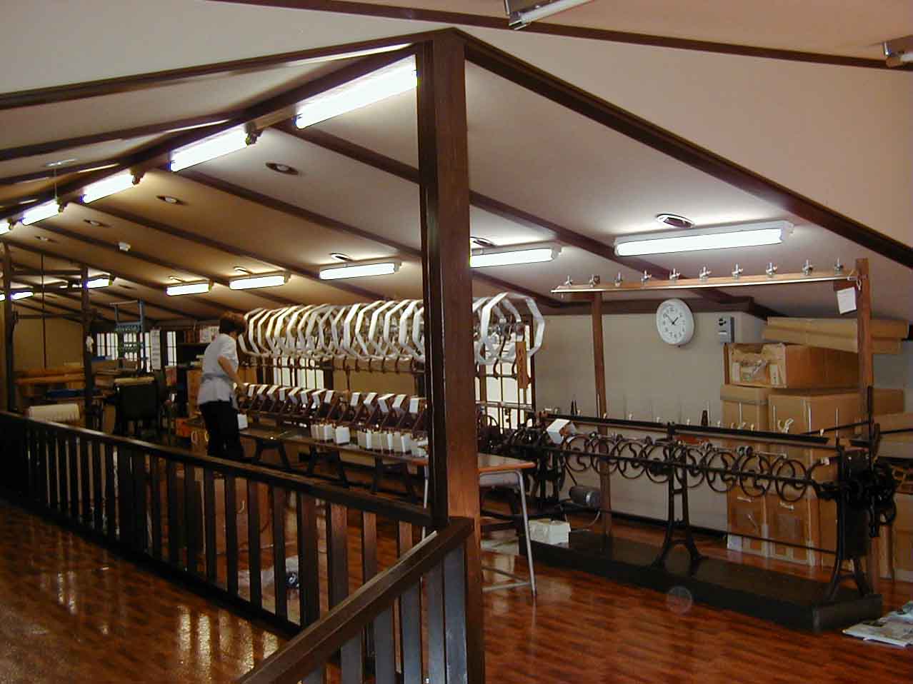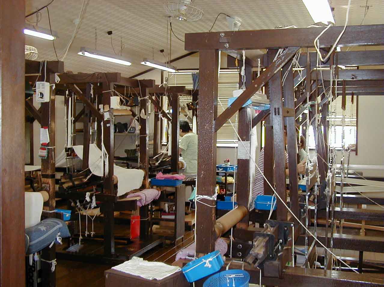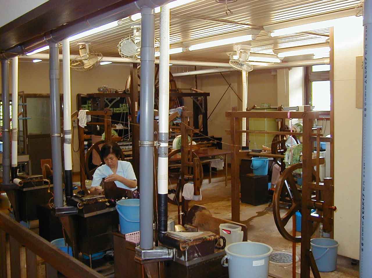 糸つむぎ作業場・奥に八丁撚糸機が見える