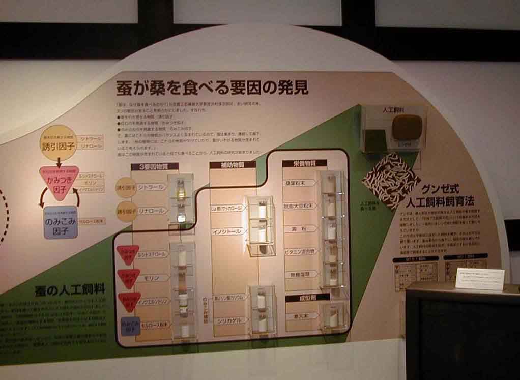 絹蔵では、養蚕から始まり、生糸が絹織物になるまでの紹介や、「蚕のいろいろ」、「蚕が桑を食べる要因の発見」等、科学館としてのおもしろさも味わえるようになっています。