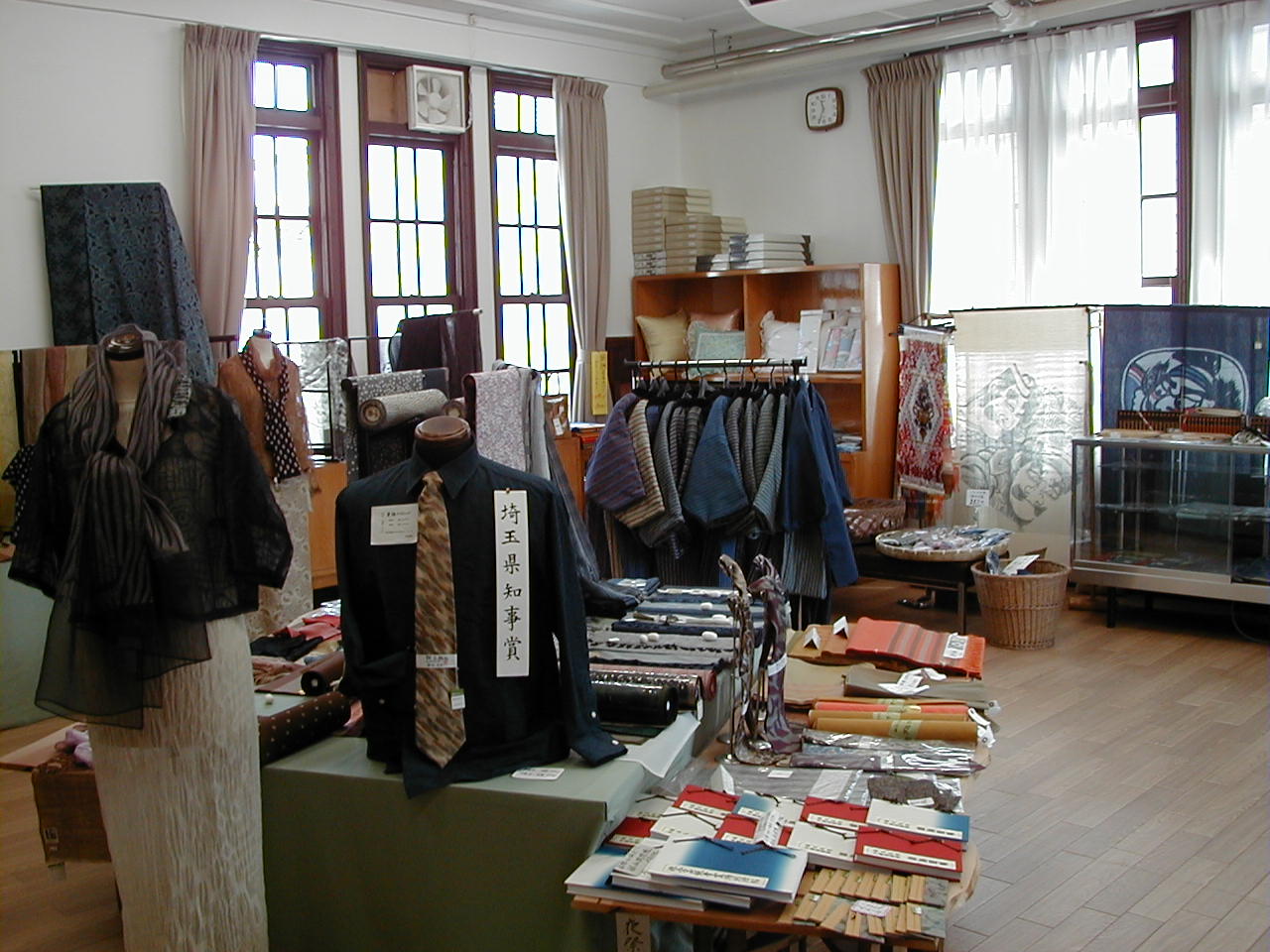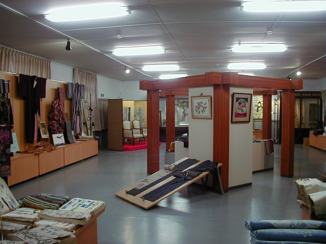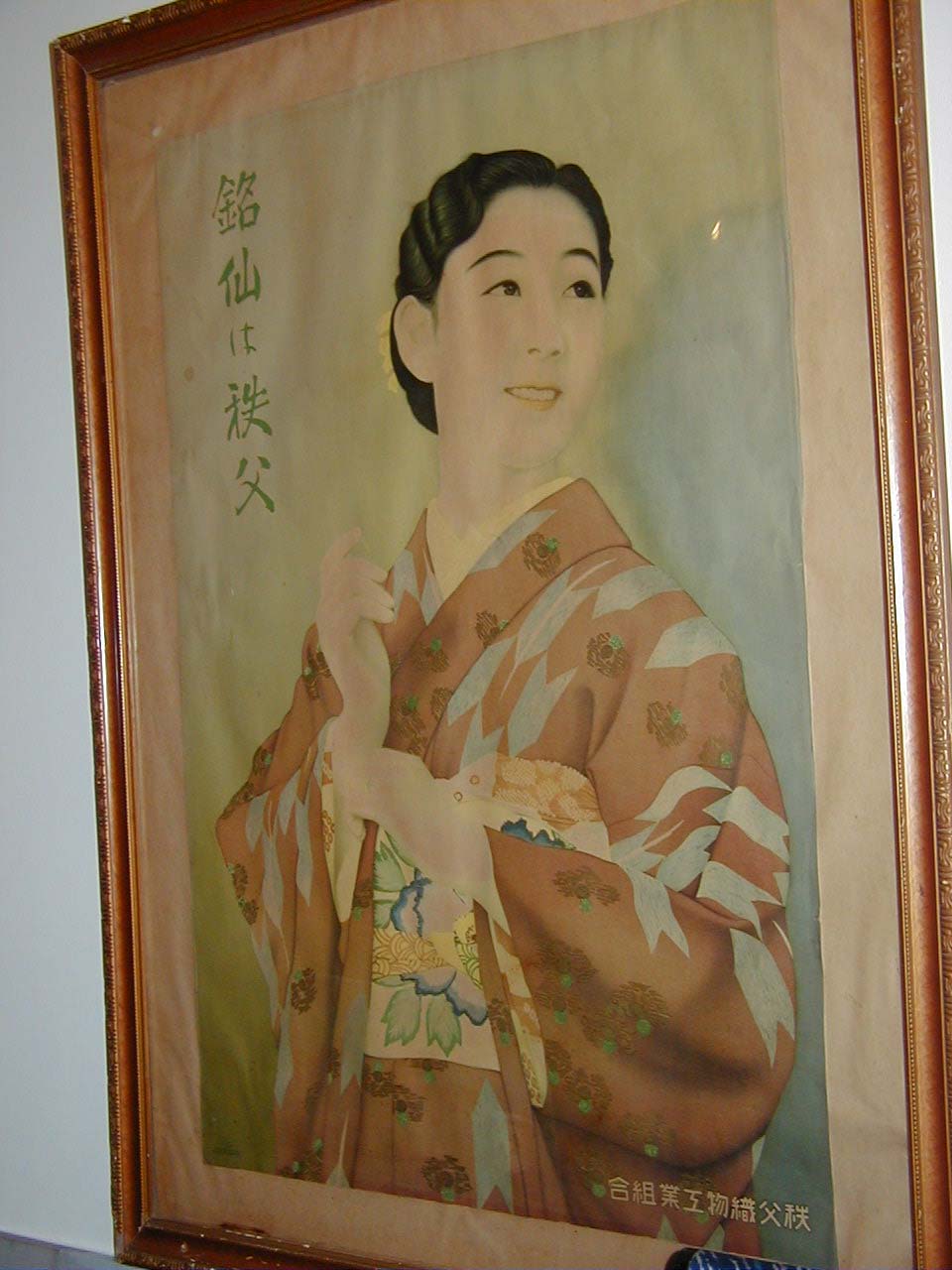 一番奥の建物を入ると左手に比較的大きな展示室があり、秩父銘仙の歴史のパネルや戦前の宣伝ポスター、色々な色柄の着物などが展示されています。